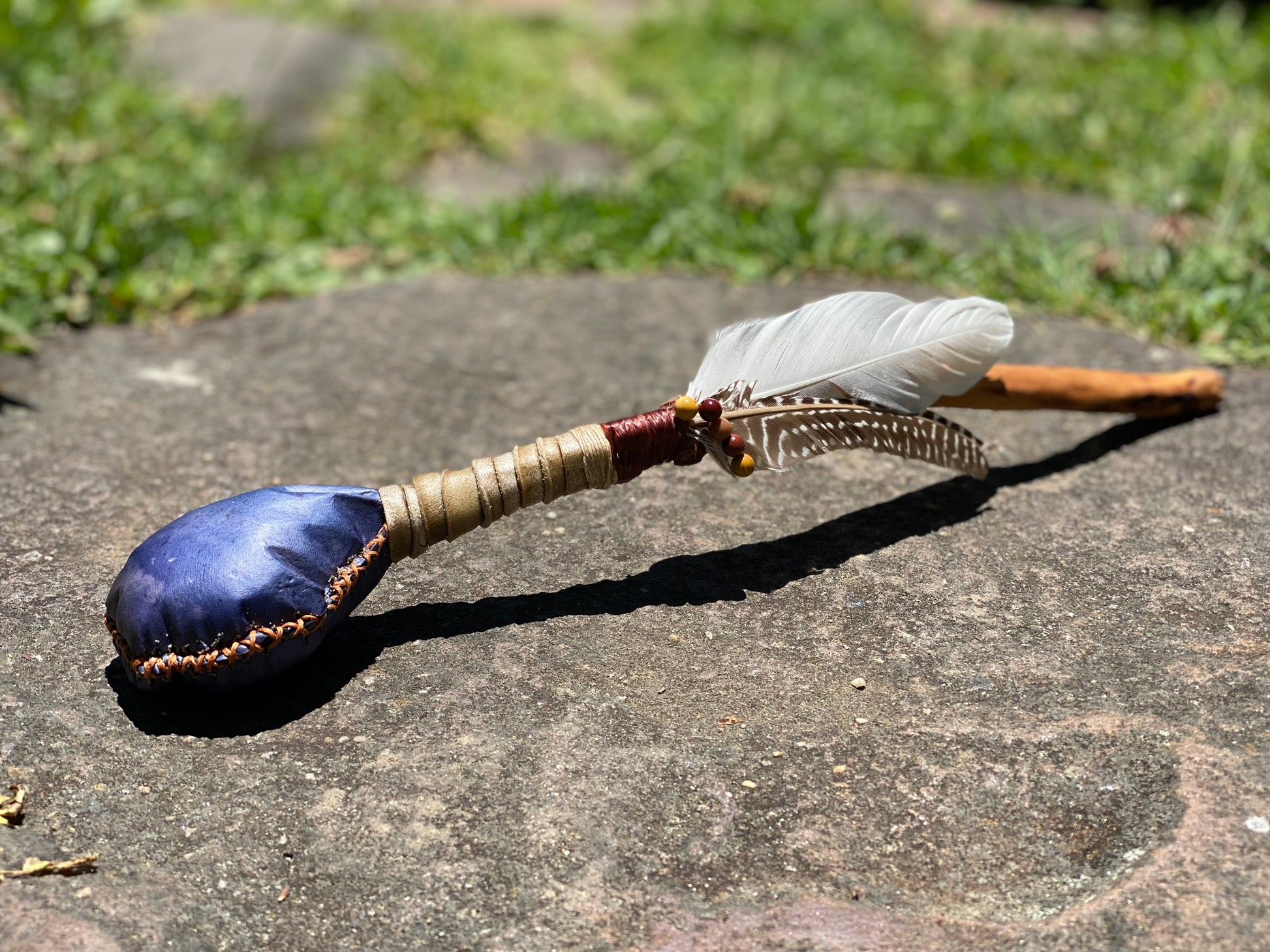 Rattles are all unique & hand made by Transformative Women’s Journeys. Skins and sounds vary quite a bit so it is best that you come in to try the rattles out in person. Beaters are also best to try with one of our in-house drums or bring your own drum in.